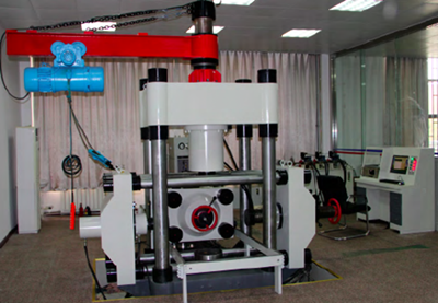 該機由加載架框架、浮動加載架、5套作動器,力傳感器、位移傳感器及壓頭部分組成。加載框架:采用門式整體鑄鋼框架結構,剛度大,軸向及水平向工作油缸置于框架的上、上下、左右對稱分布,另一方向兩個油缸固定在浮動加載架上,實現(xiàn)六面體加載試驗。移動加載框架配備移動小車,可方便地沿軌道推入拉出。